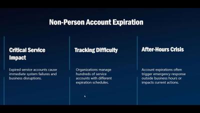 Expired non-person accounts can silently break system integrations and cause major outages—often overnight. In this video, see how Resolve automates the detection and extension of non-person account expirations across systems. Learn how to eliminate manual tracking, reduce risk, and keep your critical services running smoothly.