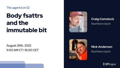 CFEngine: The agent is in 52 - Body fsattrs and the immutable bit Aug 28, 2025 By CFEngine In CFEngine "CFEngine: The agent is in" is our monthly webinar series, where we show new features, teach best practices, and keep the community informed about everything CFEngine. View Video CFEngine Automation Security Read more about CFEngine: The agent is in 52 - Body fsattrs and the immutable bit