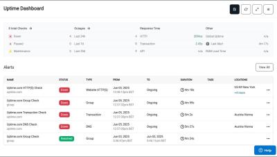 Get a complete overview of the Uptime.com Dashboard in this video! Learn how to monitor your checks, customize the layout, and analyze global uptime metrics and alerts. See how to view response times, sort check cards, manage alerts, adjust auto-refresh settings, and save multiple personalized dashboards. Whether you're tracking uptime, organizing by tags, or customizing alerts, this guide covers everything you need to make the most of your dashboard.