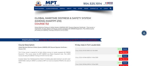 MITAGS provides a downloadable test pool so incoming students can study the course exam’s 100 questions after getting enrollment confirmation. The two-week class is available at two locations. Participants get instructor-led time where they will learn Digital Selective Calling (DSC) procedures, survival craft equipment management, principles of communication and more.