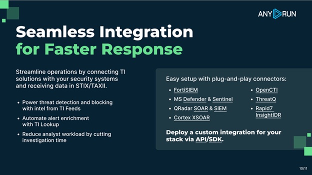 ANY.RUN’s threat intelligence solutions TI Lookup and TI Feeds offer a broad range of opportunities for flexible integrations and connectors from leading vendors, as well as STIX/TAXII & API/SDK custom integration options.