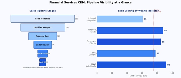 This is the problem Pipeline CRM for financial services is designed to solve.It centralises client data, investment goals, and risk tolerances in one place, and scores leads based on wealth indicators, credit history, and investment goals — so advisors focus on the prospects most likely to convert.