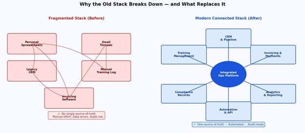 None of this requires custom development. Most modern CRMs and training management platforms offer API access and pre-built integrations with tools like Zapier, QuickBooks, and Outlook. The key is treating your ops stack as a system rather than a collection of individual tools. Each component should hand off cleanly to the next.
