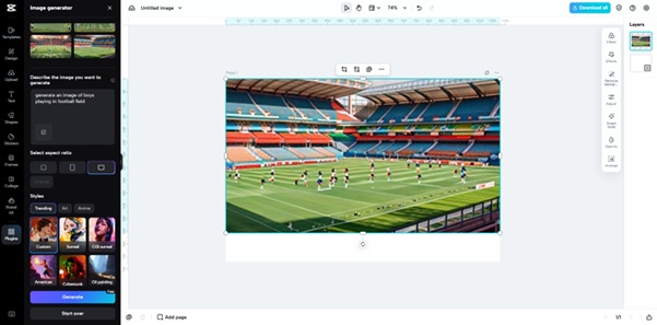 A pop-up box lets you choose from preset or custom sizes. On the left menu, press "Plugins" and go to "Image generator". Upload your face reference photo from local storage, Cloud, Google Drive, or Dropbox. If you don’t have one, create faces directly from text prompts.
