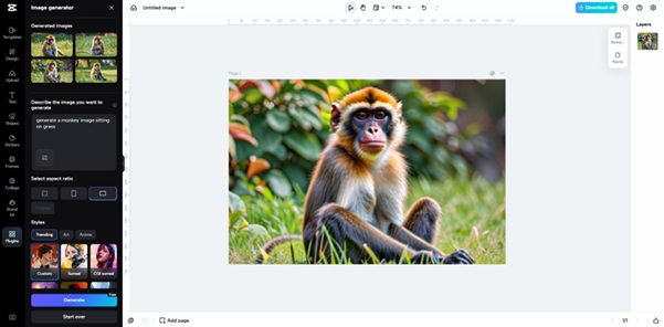 Add your text prompt, then set aspect ratio and style for your image. Use advanced settings to manage prompt weight and scale through the slider. Higher values give more accurate facial detailing. Press "Generate" to create the refined face. Afterward, smoothen and enhance it with CapCut’s filters, effects, stickers, and more.