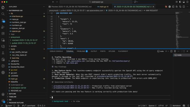 I just hit approve on each command and watched it work. The mock server returned production responses for known requests. For the new /api/launches-summary endpoint that wasn’t in the recording, it passed through to the actual SpaceX API—so even brand-new stuff got tested.