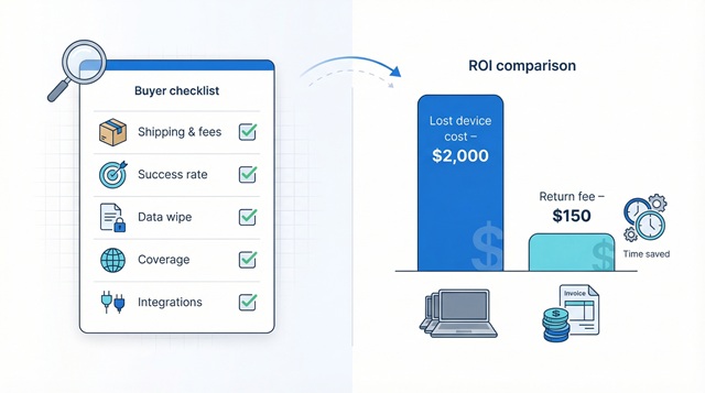 Now shift to savings. Replacing a lost MacBook can cost about $2,000 in hardware alone, not counting breach exposure or audit fines. If a platform charges $150 per successful return, you break even on the first device it rescues. Add the hours your team reclaims—no more chasing tracking numbers—and the payback period often shrinks to weeks, not months.